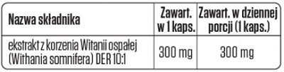 Składniki: ekstrakt z korzenia Witanii ospałej (Withania somnifera) DER 10:1, składnik kapsułki (żelatyna – składnik otoczki)