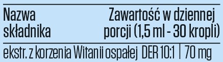 Składniki: woda, substancja emulgujaca – lecytyna (z soi), ekstrakt z korzenia Witanii ospałej (Withania somnifera) DER 10:1, przeciwutleniacz: alfa-tokoferol, konserwant: sorbinian potasu.